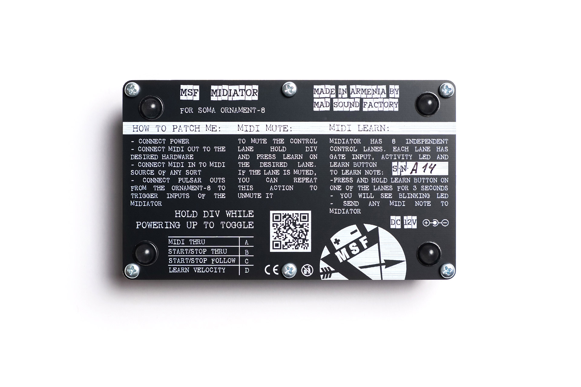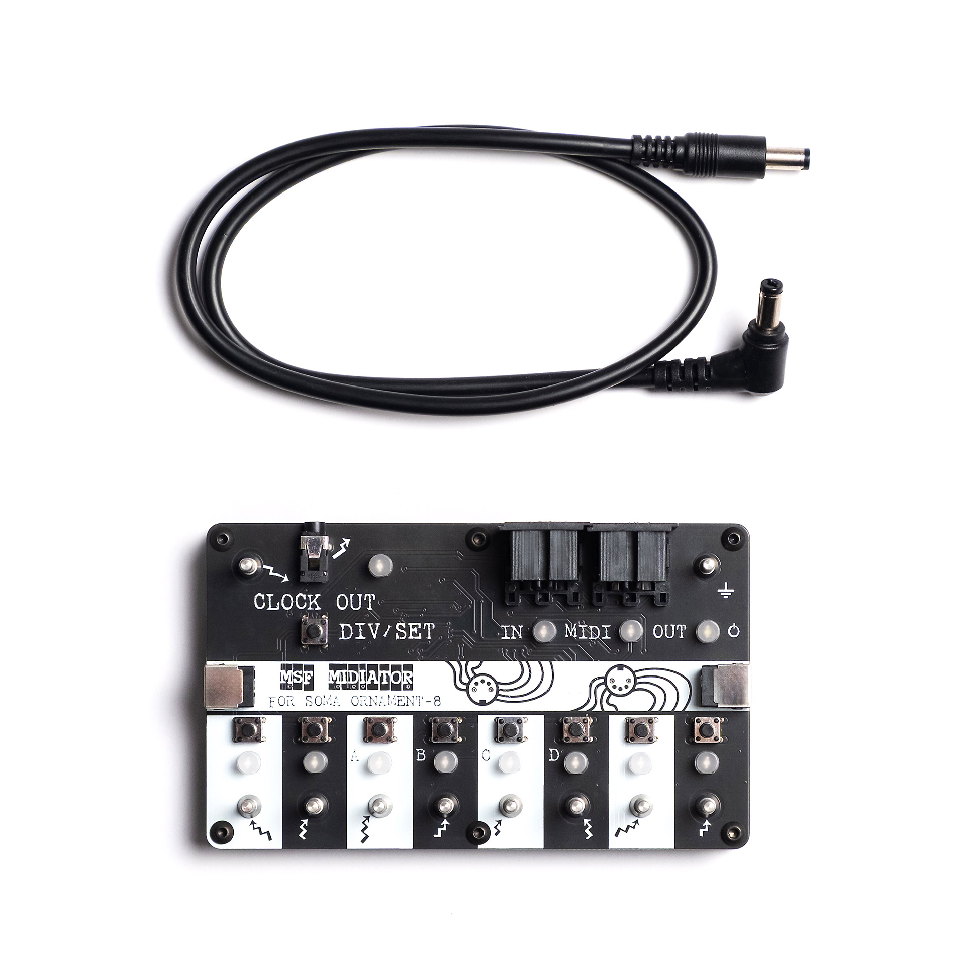 Mad Sound Factory MIDIATOR allows the SOMA ORNAMENT-8 to sequence MIDI gear, bringing its unique sequencing style to the digital control domain. It contains 8 identical independent GATE IN — MIDI OUT lanes to produce up to 8 MIDI events with assignable note, channel and velocity. It works great with digital drum machines, multi-timbral synths and samplers.